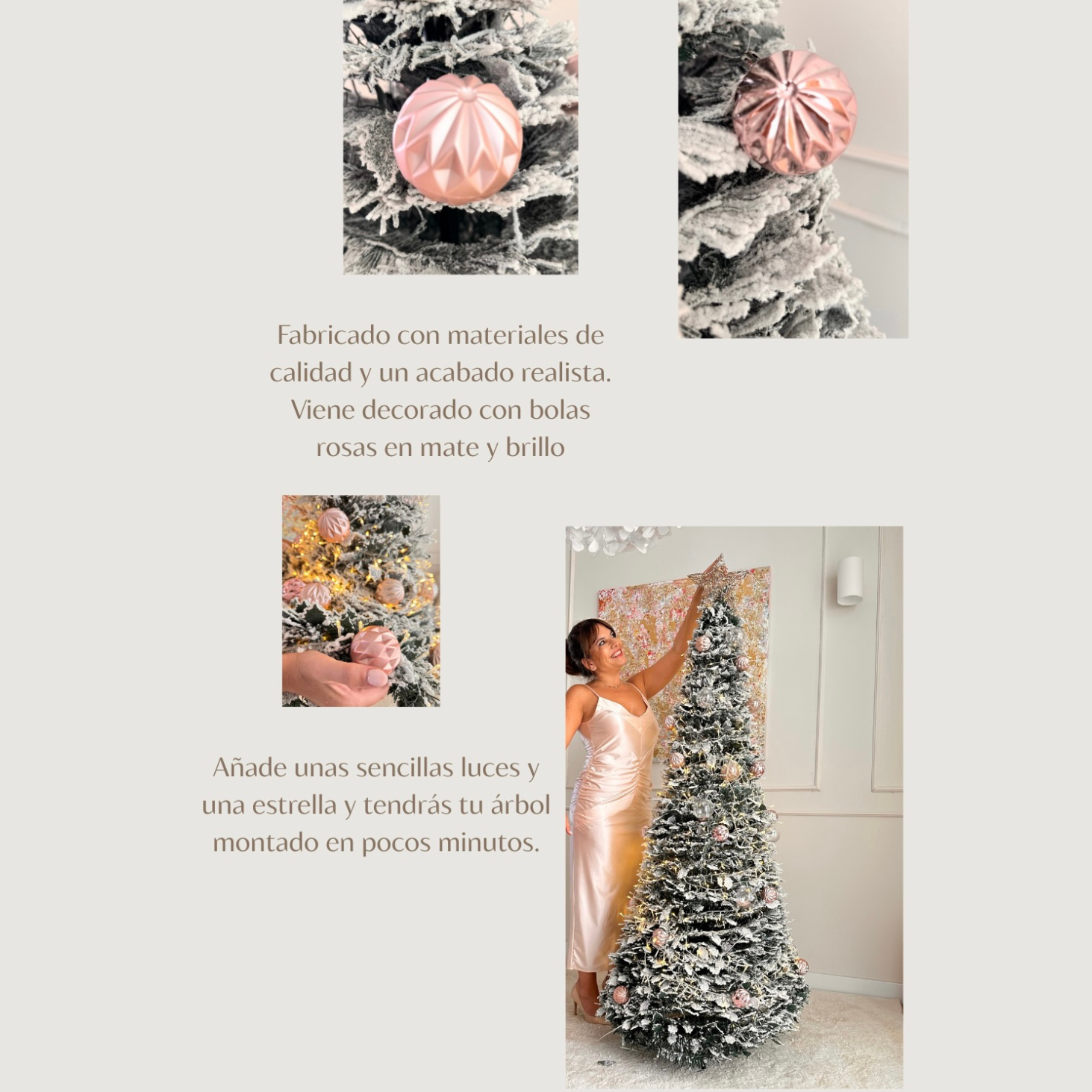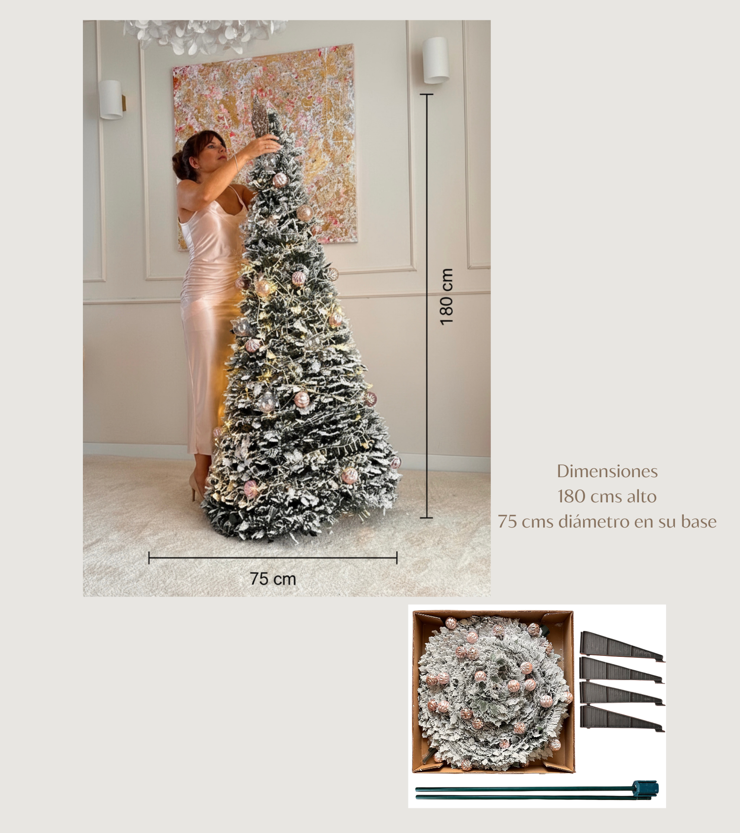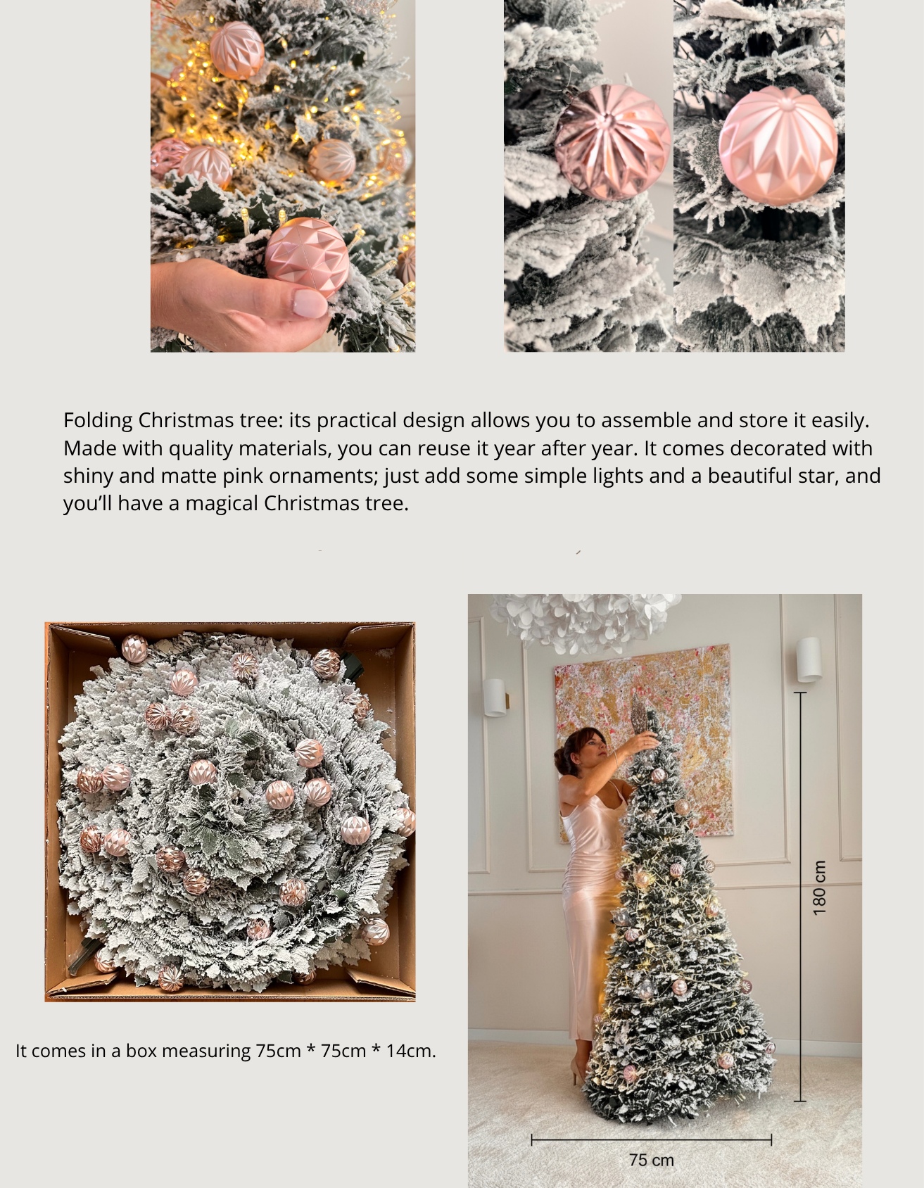 Size: 180 cmIt will arrive folded, with the foot disassembled, with beautiful pink balls that will combine with any decoration you want to add: traditional red, pink for a sweeter touch, or simply a garland of lights to give it a magical touch. Orders are limited to one unit per customer. If you wish to purchase more units, please contact us. Write to us at hola@rosehome.es