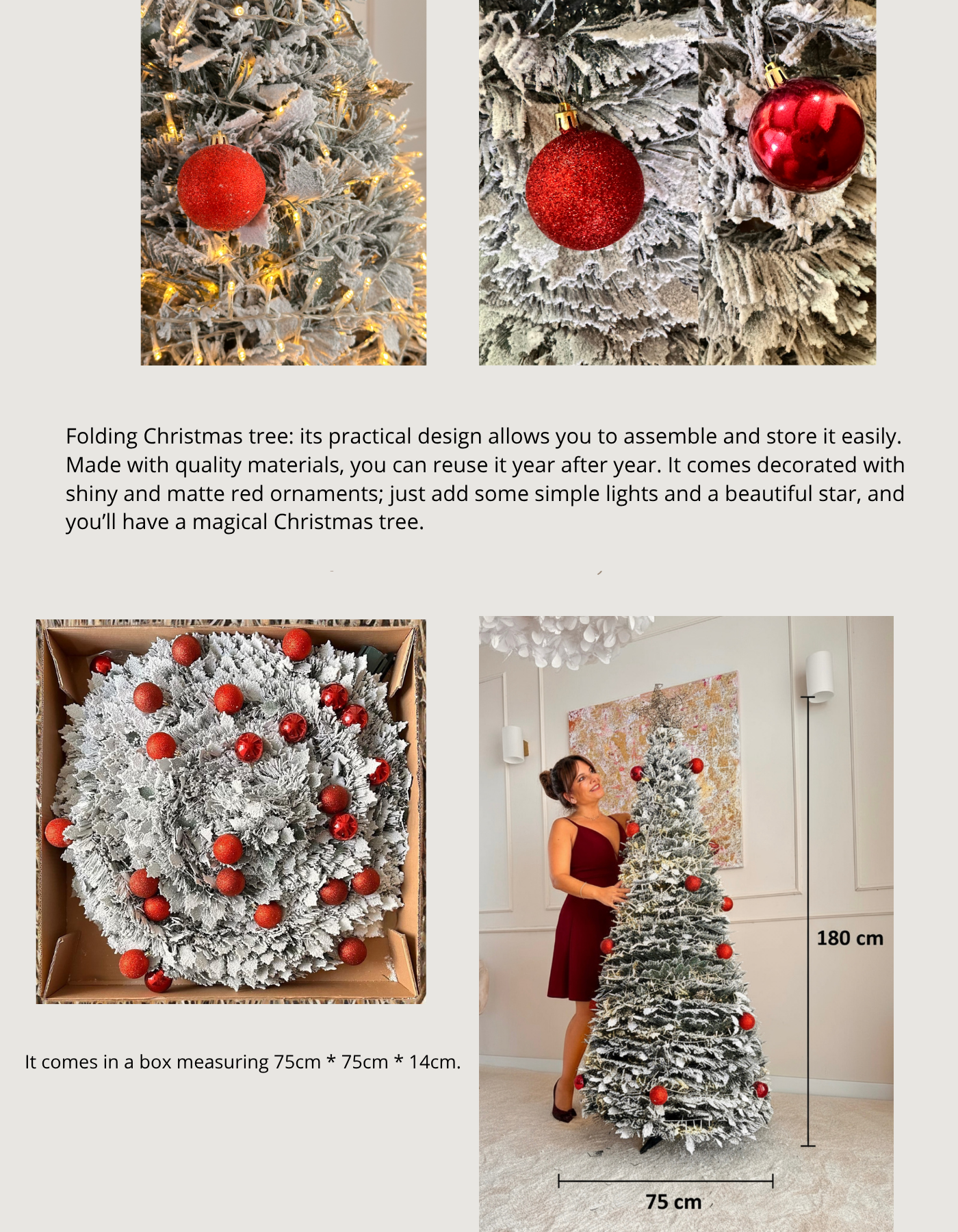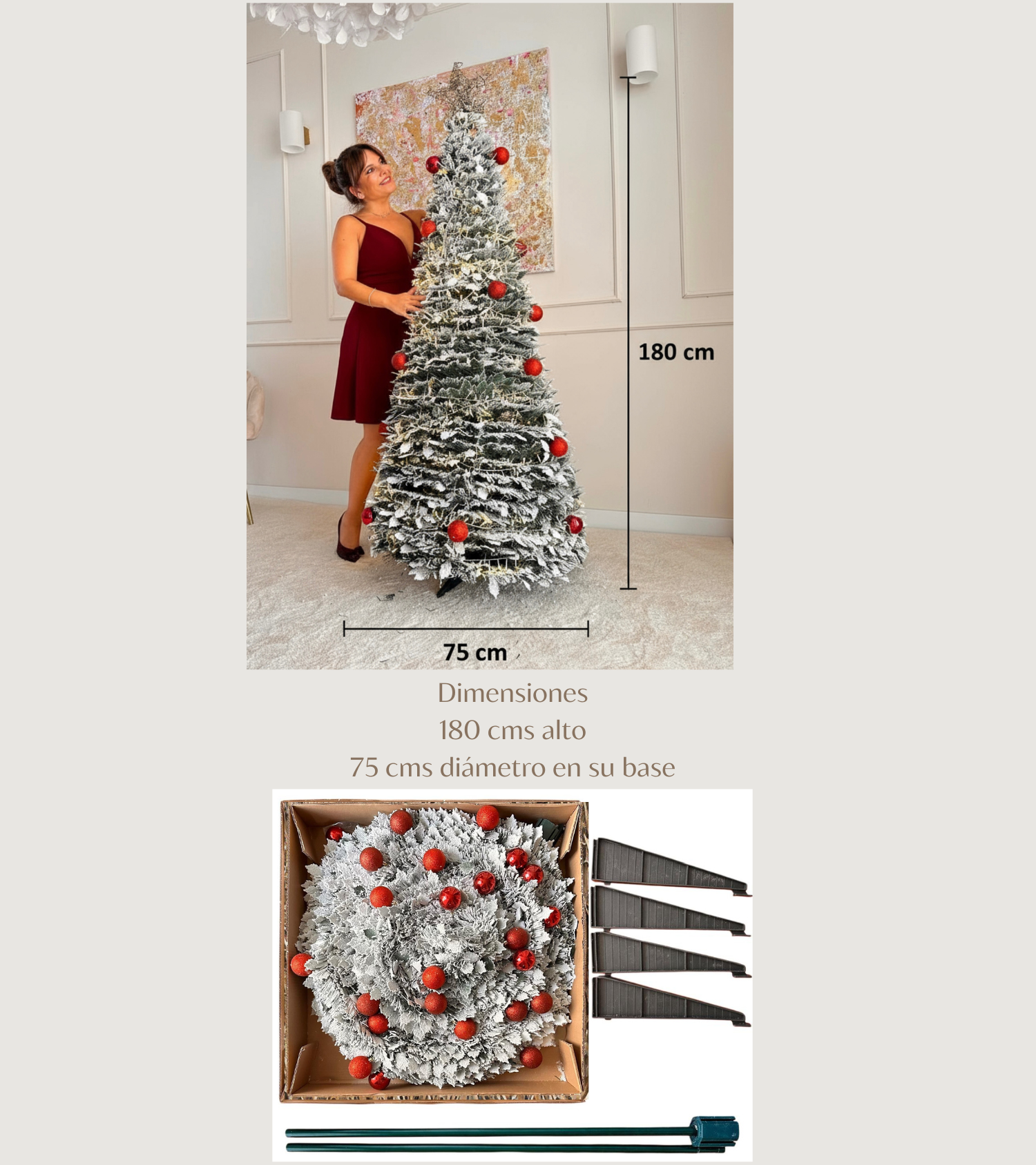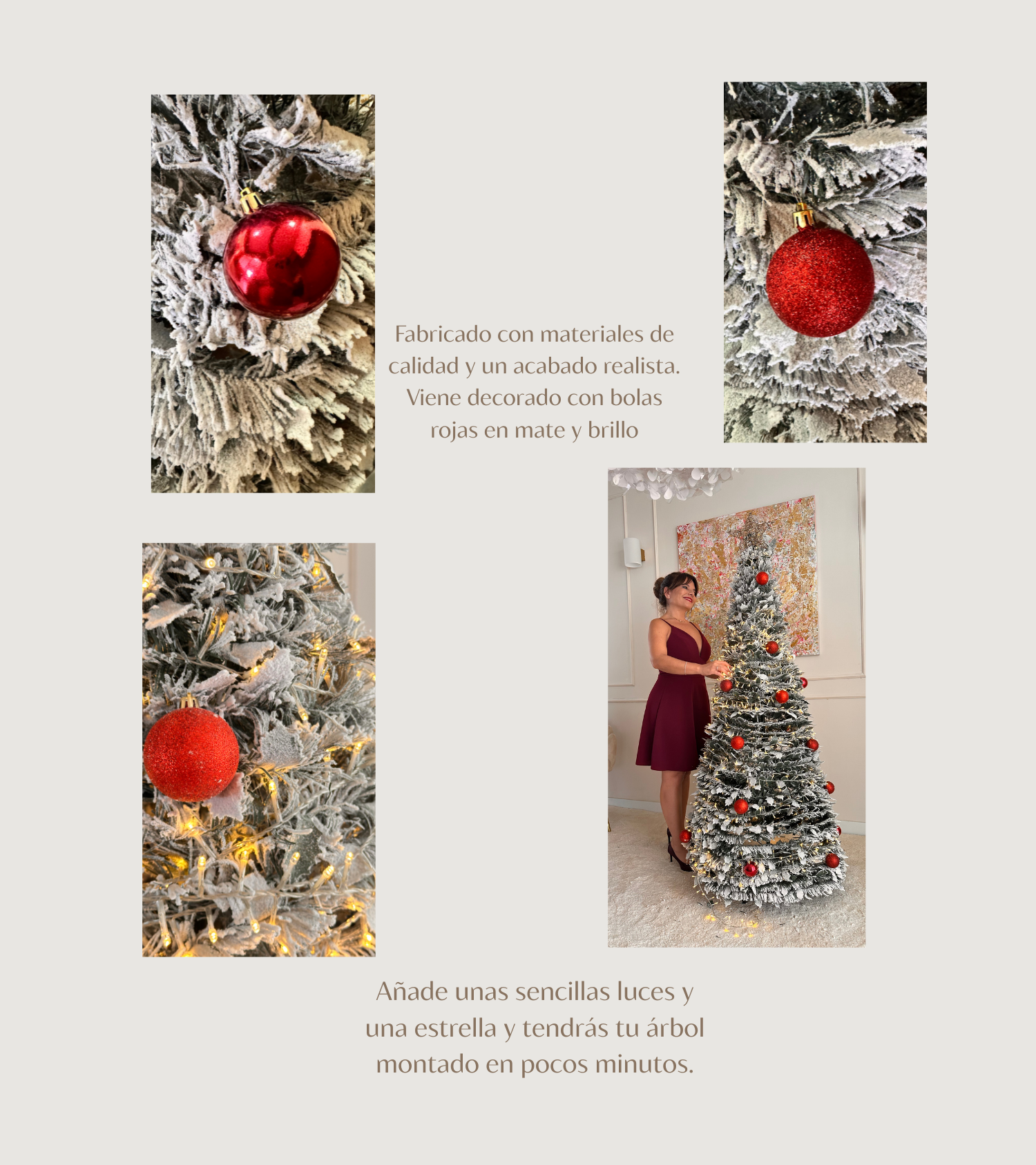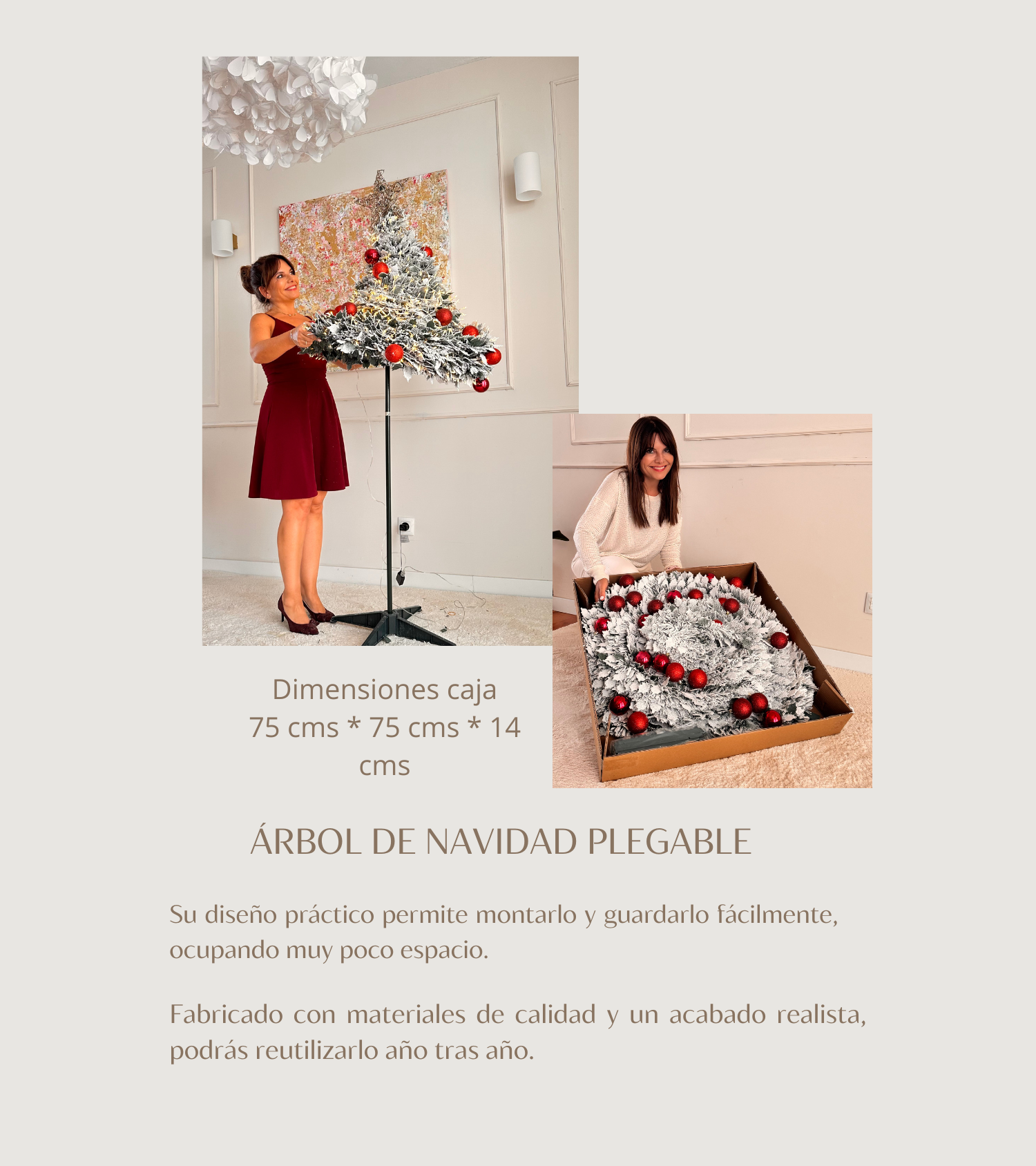 Te llegará plegado, con el pie desmontado, con unas bonitas bolas rojas que combinarán con cualquier decoración que quieras añadir: tradicional en tonos rojos, rosas para un toque más dulce, o simplemente una guirnalda de luces para darle un toque mágico.